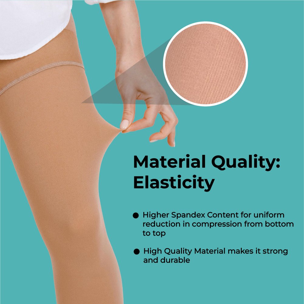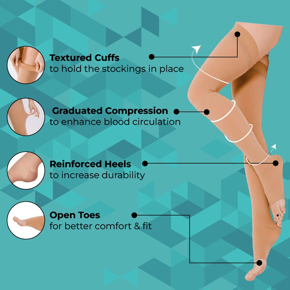 Manufactured using soft, breathable, and moisture-wicking medical-grade fabric, the stockings ensure comfort during extended wear. The ergonomic anatomical fit, non-constricting top band, and thigh-length design make them easy to wear while maintaining consistent compression throughout the day. With open-toe access for easy circulation monitoring and latex-free construction, these stockings offer a safe, durable, and reliable solution for hospital and home care use.