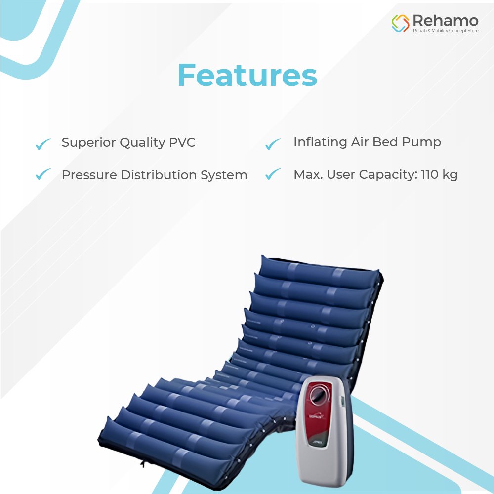 The tubular PVC air mattress works in sync with a fast-inflating, energy-efficient pump that alternates air pressure across individual air cells. This continuous pressure redistribution minimizes the need for frequent manual repositioning while significantly enhancing patient comfort. Suitable for hospital, nursing home, and home-care environments, the system supports users up to 135 kg and ensures safe, durable, and reliable performance for extended use.